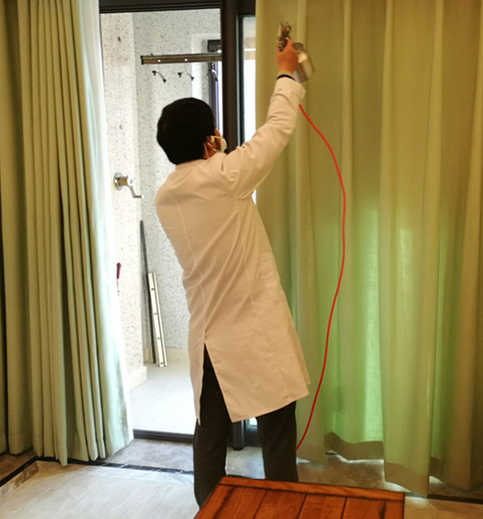 使用药剂及施工方案: 主要药剂有甲醛消除剂、纳米光触媒。根据这套房子室内装修情况,对于集中定做的柜子和抽屉,我公司施工人员使用甲醛清除剂对柜子和抽屉进行全面喷洒,重点治理,施工时保证全面均匀、不留死角,另外对墙面和沙发,坐垫窗帘等布饰使用光触媒治理,在分解污染源的同时,增加光触媒的受面,能分解游离的甲醛其他污染物,下面为施工现场照片: